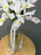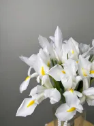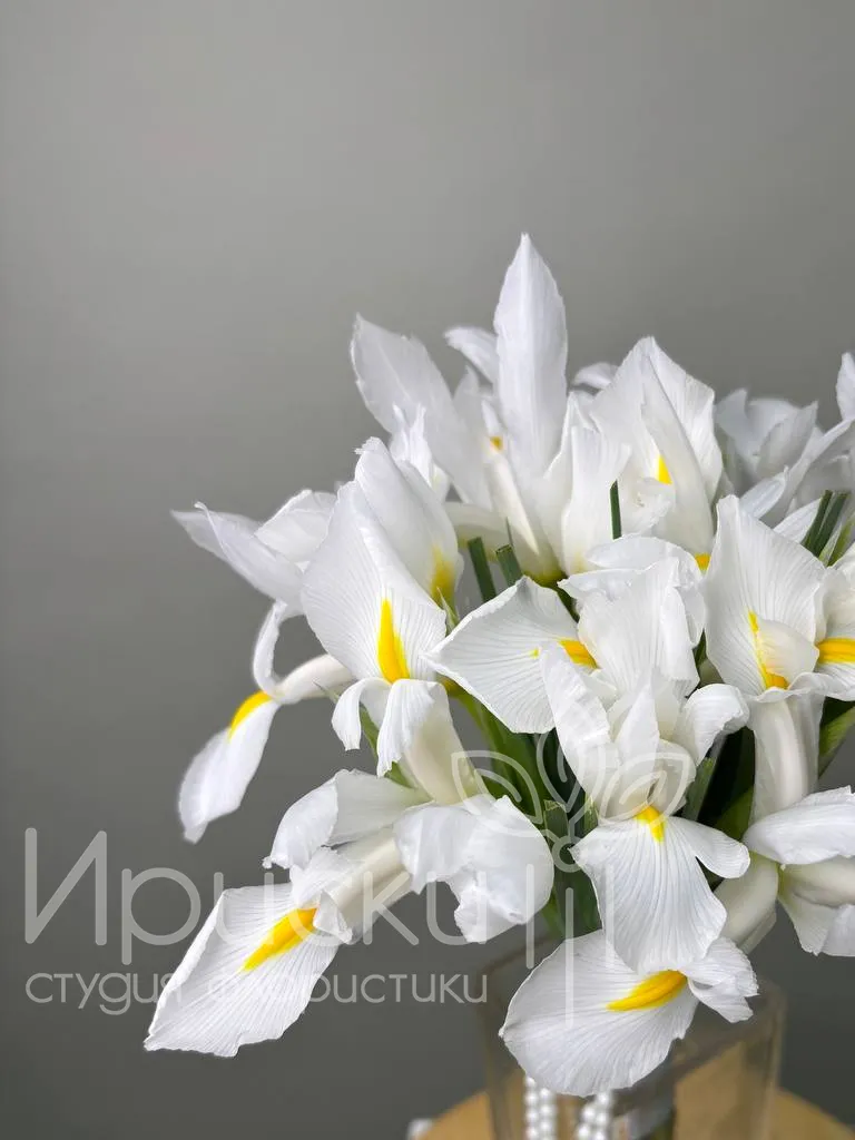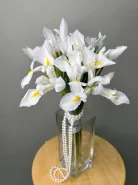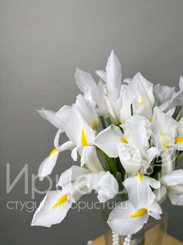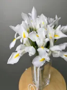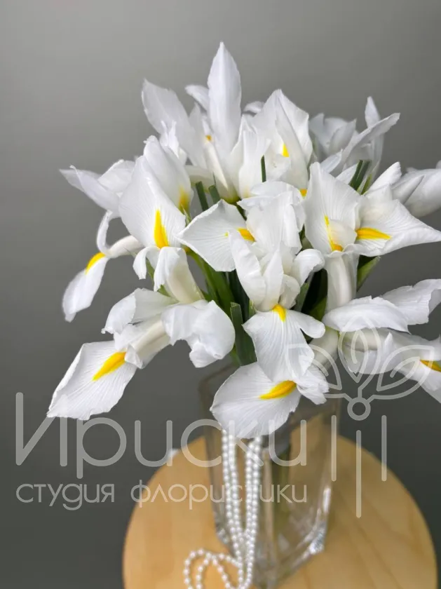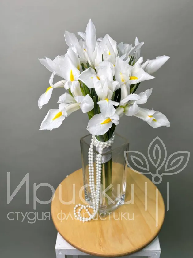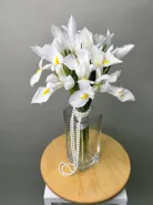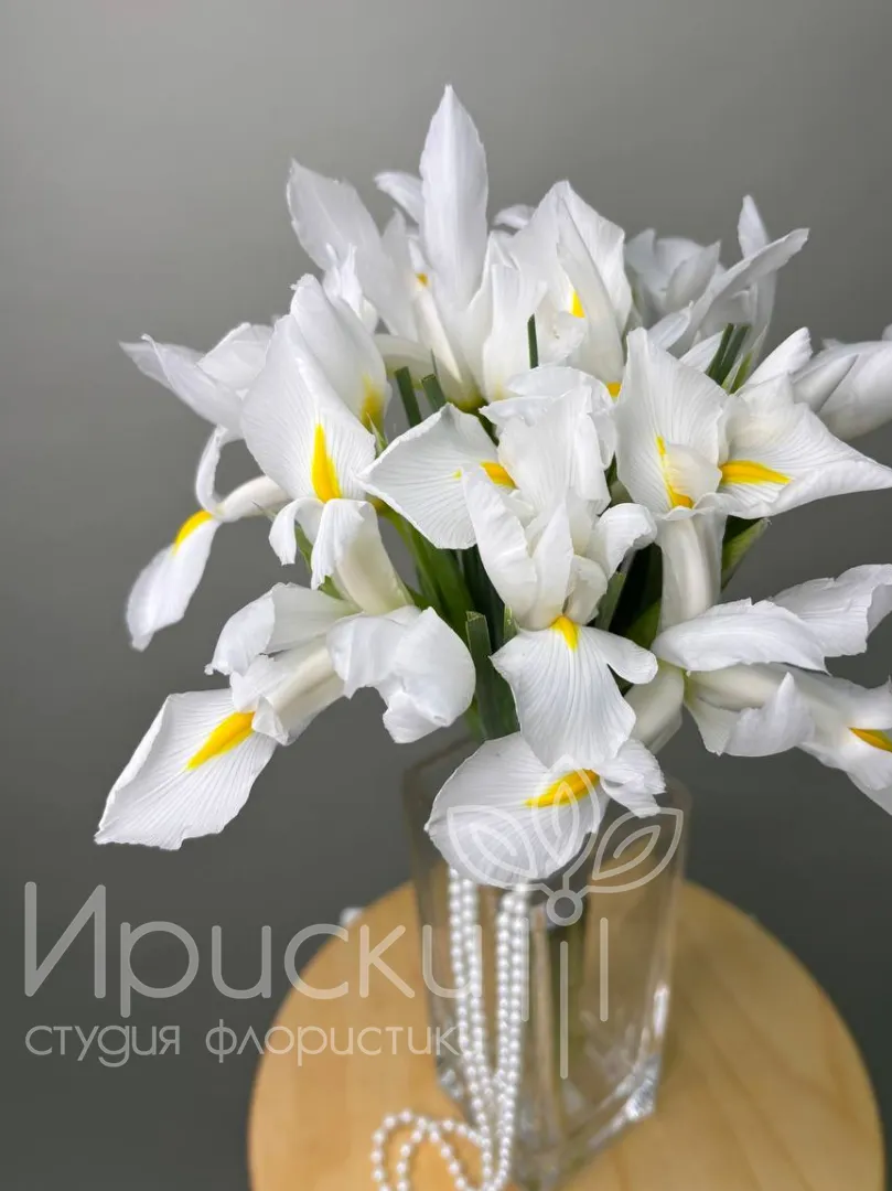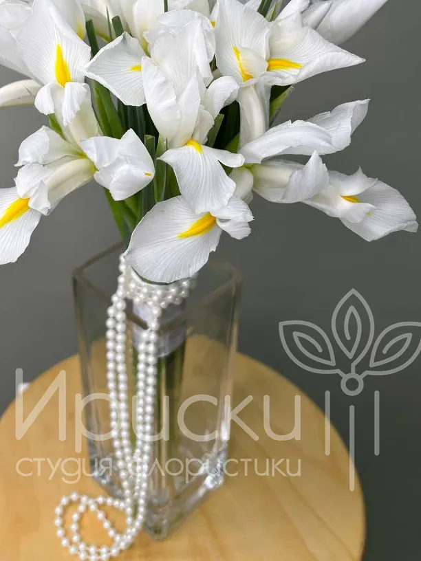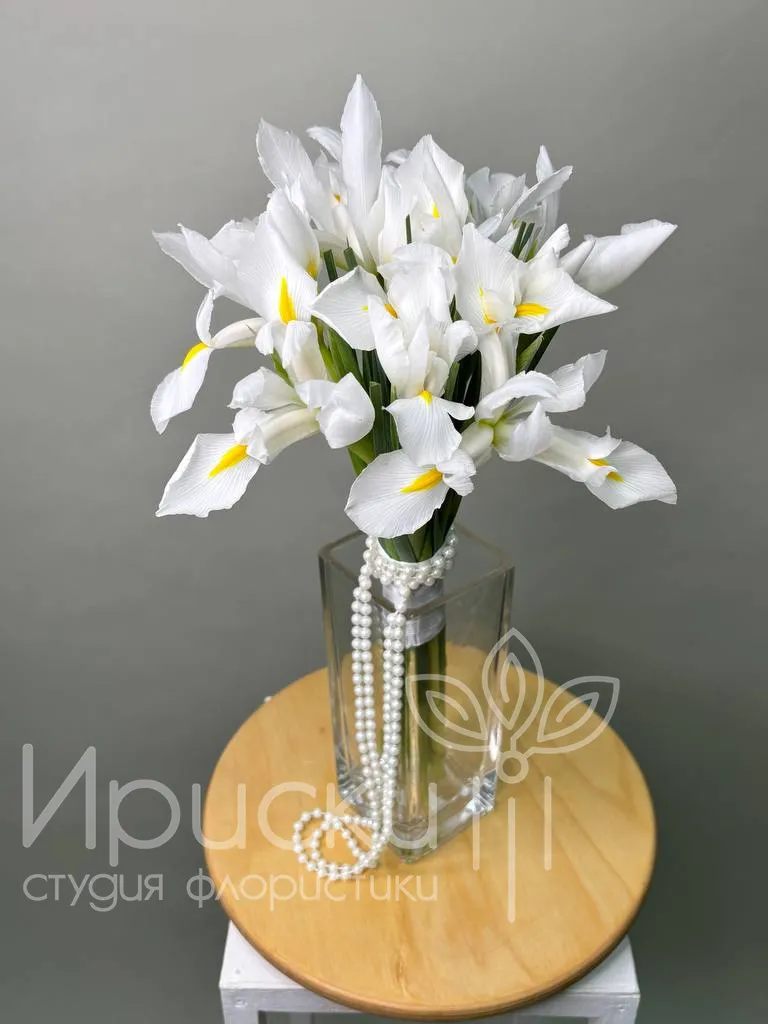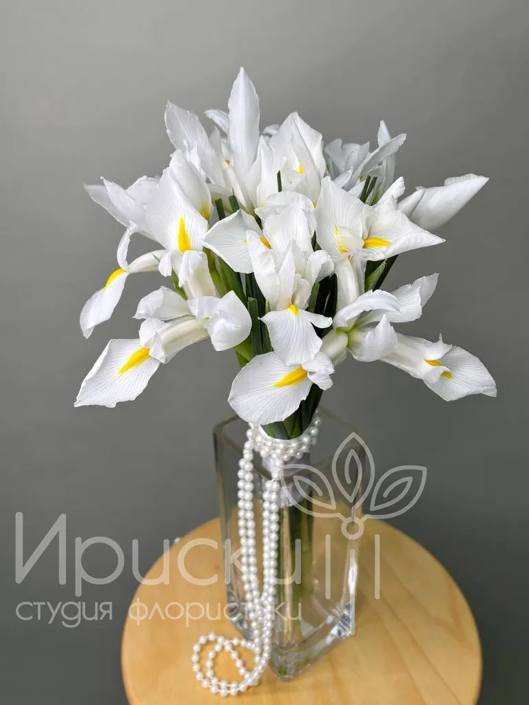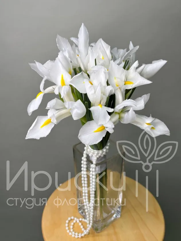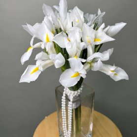 Монобукет из нежных белых ирисов - один из самых редких и изысканных цветов. Букет дополнен тонкими нитями жемчужин.