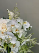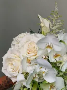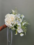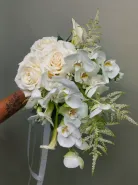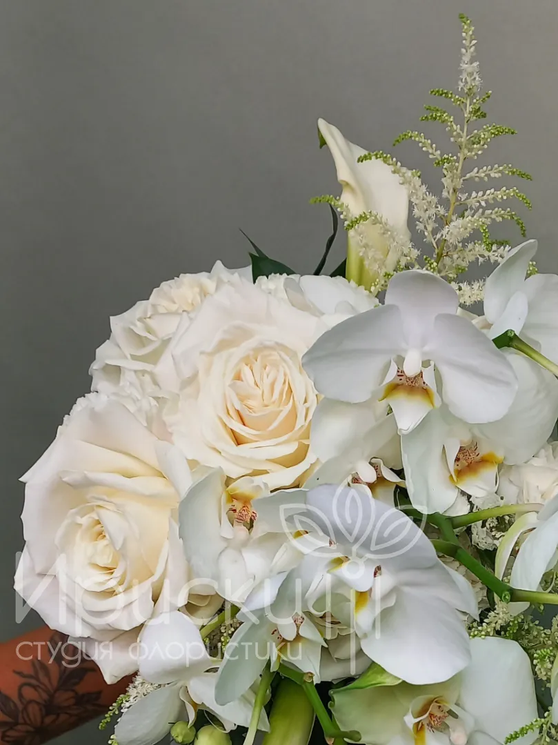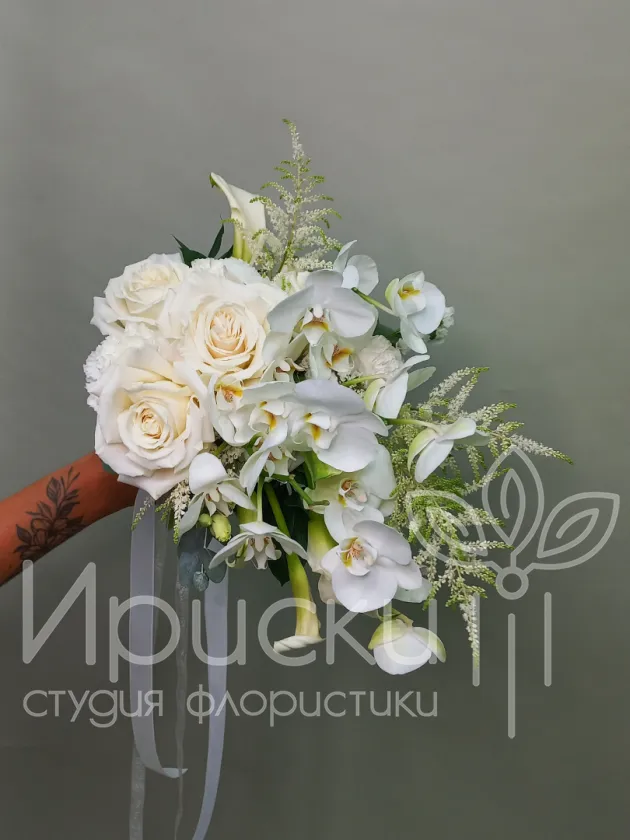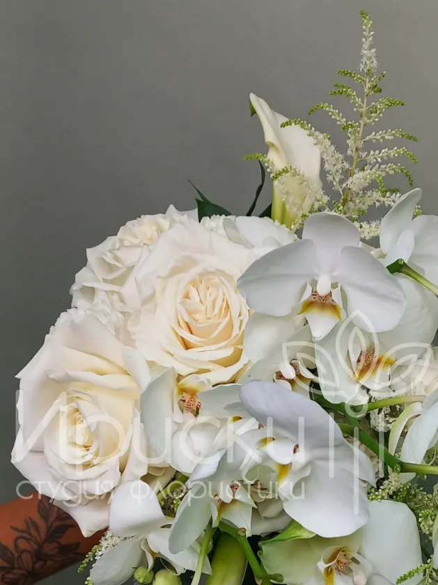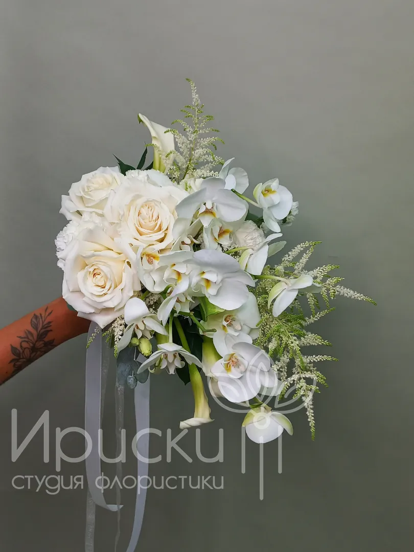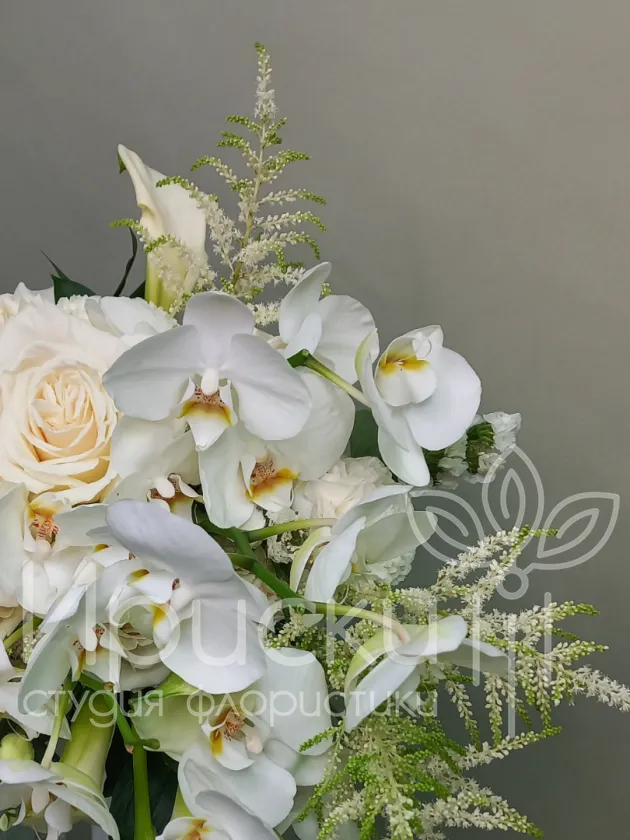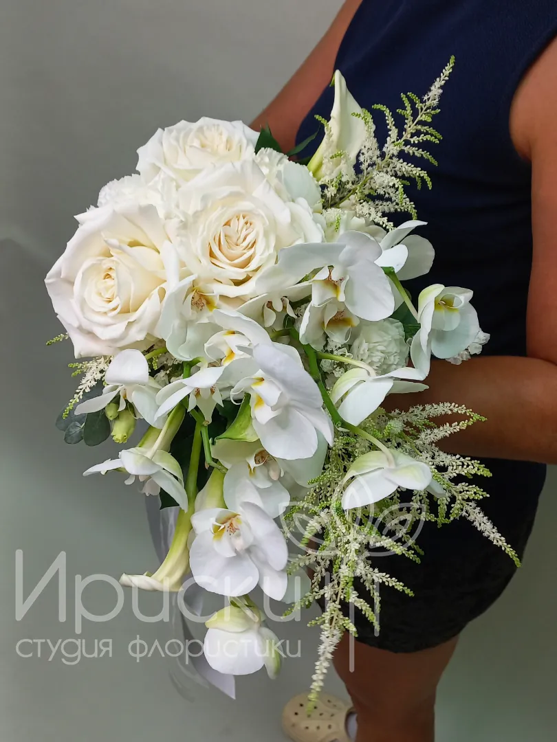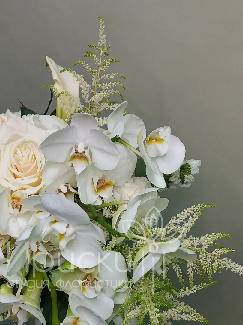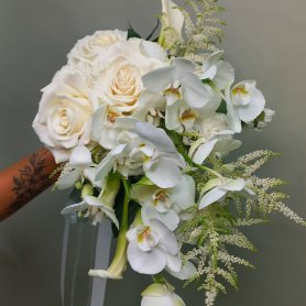 Этот букет невесты как пышный ниспадающий водопад из самых изысканных цветов: орхидея фаленопсис, каллы, астильба. Дополнены сливочными розами.
