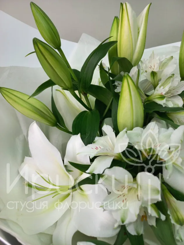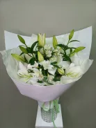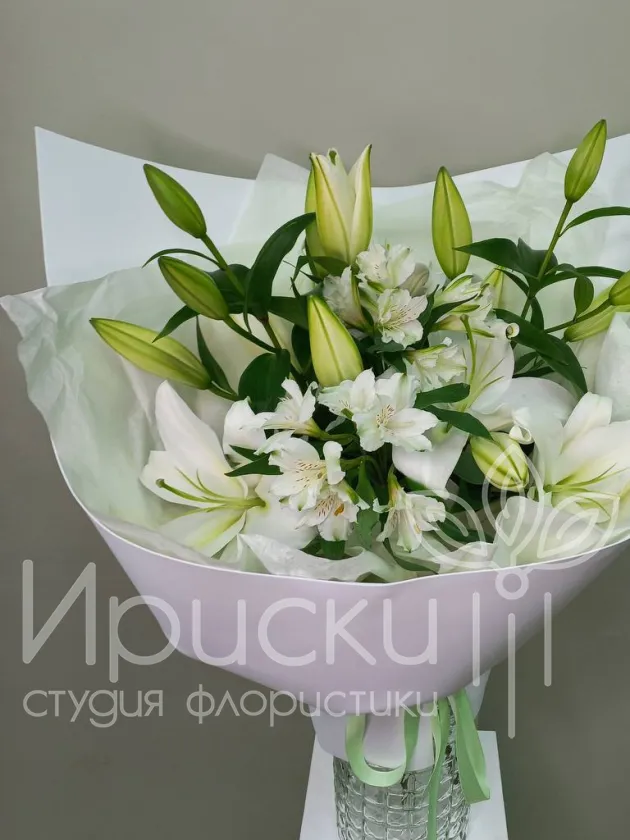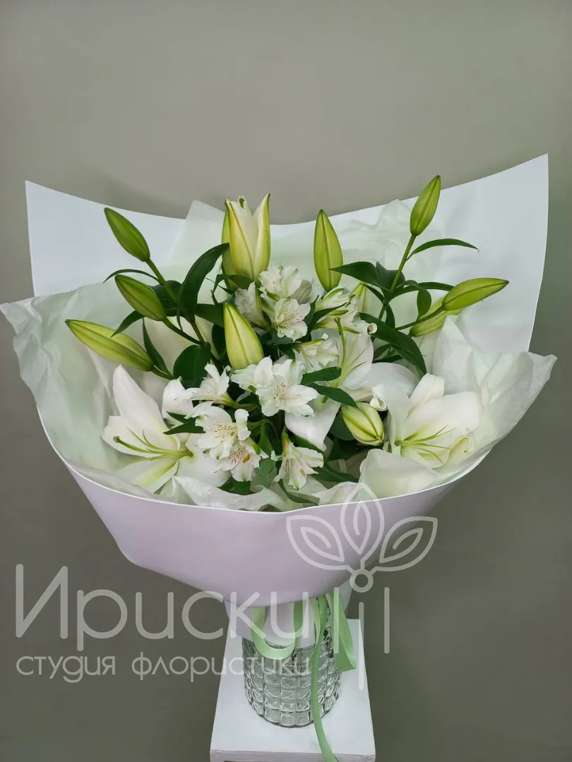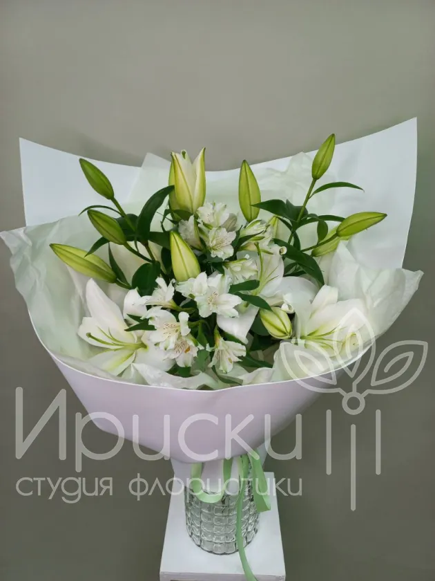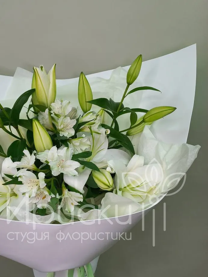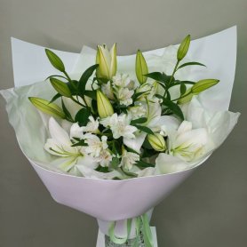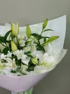 Пышный ароматный букет с белоснежными лилиями и альстромериями. Лилии, альстромерии - рекордсмены среди цветов по длительности жизни в вазе. К тому же, лилии распускают свои закрытые бутоны даже в срезанном виде в вазе. Эти цветы - символ чистоты и глубины.