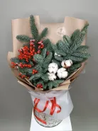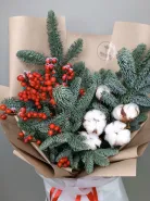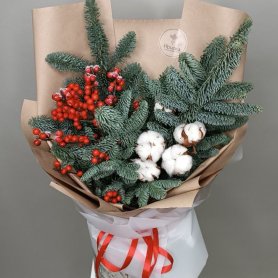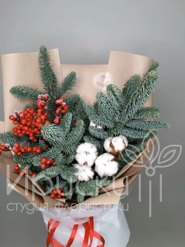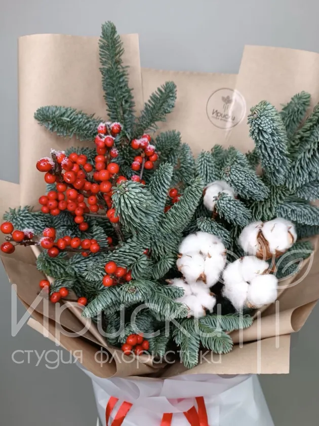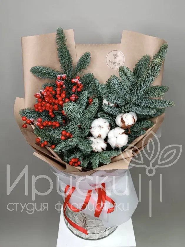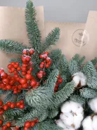 Зимний букет из ароматных хвойных неосыпающихся веточек Нобилиса - датской пихты., ярко-красных ягод Илекса ии натуральным хлопком.